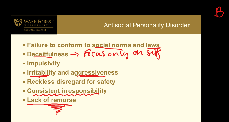 Cluster B (Dramatic, Emotional, or Erratic): Disregard for and violation of rights of others; failure to conform to laws; deceitfulness; impulsivity; irritability/aggressiveness; reckless disregard for safety; consistent irresponsibility; lack of remorse.