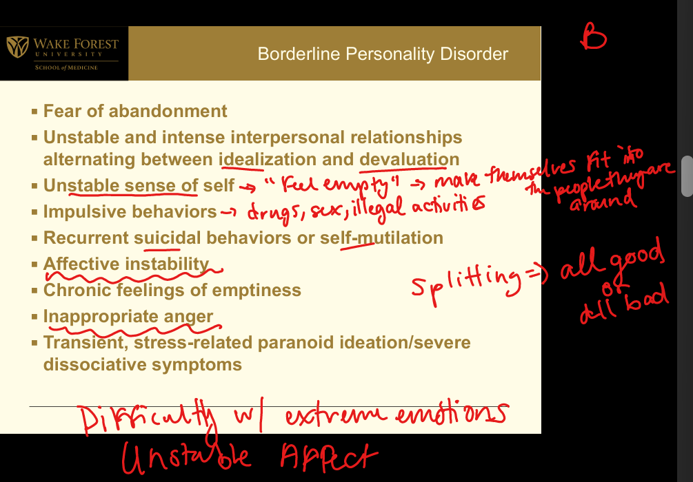 Cluster B (Dramatic, Emotional, or Erratic): Instability in relationships, self-image, and affect; frantic efforts to avoid abandonment; unstable intense relationships (idealization/devaluation); identity disturbance (“feel empty”); impulsive behaviors (sex, drugs, spending); recurrent suicidal behavior/self-harm; affective instability; chronic emptiness; inappropriate anger; transient stress-related paranoia or dissociation. Splitting(all good or all bad)