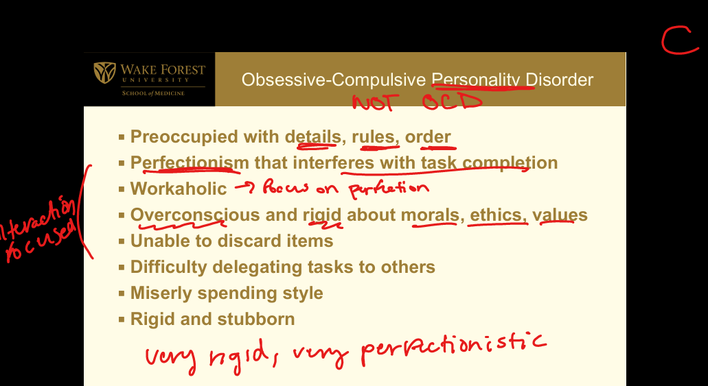 Cluster C (Anxious or fearful): Preoccupation with orderliness, perfectionism, and control; perfectionism interferes with task completion; workaholic; overly conscientious and rigid about morals/ethics; difficulty discarding items; difficulty delegating; miserly spending; rigid and stubborn.