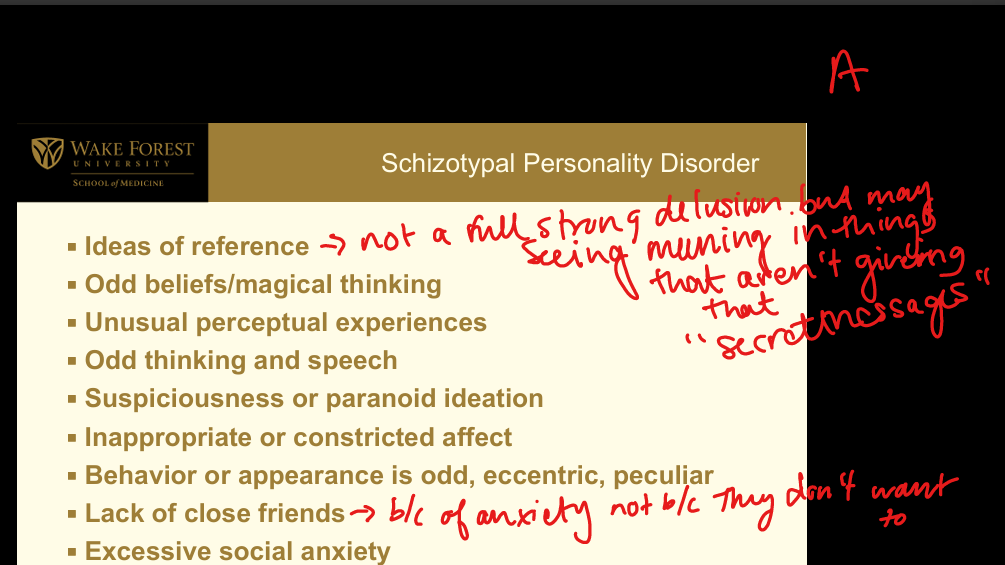 Cluster A (Odd or Eccentric): Discomfort with close relationships; ideas of reference; odd beliefs/magical thinking; unusual perceptual experiences; odd thinking/speech; suspiciousness; inappropriate/constricted affect; eccentric behavior/appearance; few close friends due to social anxiety; excessive social anxiety driven by paranoia. (Play magic with no Pals)