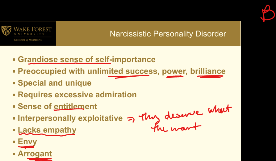 Cluster B (Dramatic, Emotional, or Erratic): Grandiosity; preoccupied with fantasies of success/power/brilliance; believes they are special/unique; requires excessive admiration; sense of entitlement; interpersonally exploitative; lacks empathy; envious of others; arrogant behaviors/attitudes.