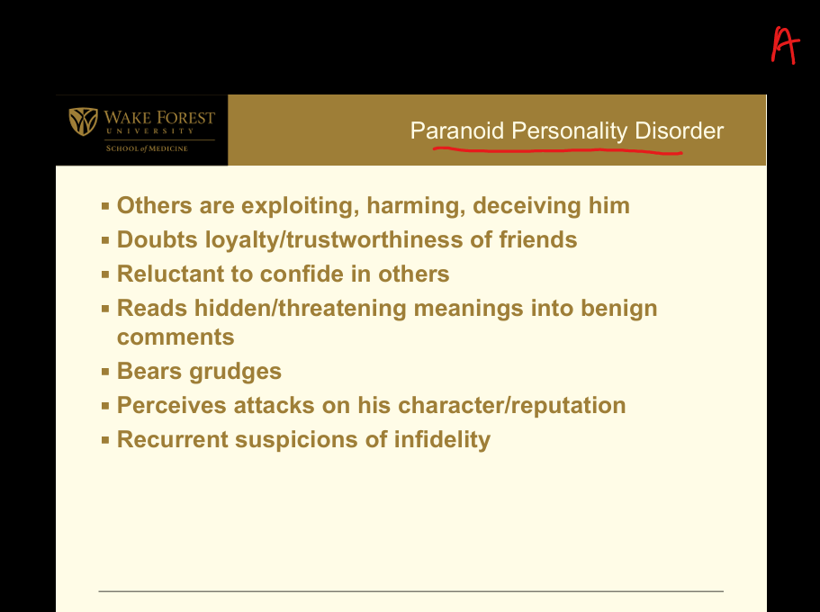 Cluster A (Odd or Eccentric): Distrust and suspiciousness of others; believes others are exploiting/harming/deceiving them; doubts loyalty; reluctant to confide; reads hidden meanings into benign remarks; bears grudges; perceives attacks on character; recurrent suspicions of infidelity.