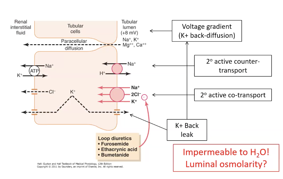 Key identifiers: The Na+/K+/2Cl- symporter on the apical membrane. This transport processes senses the sodium/chloride concentration in the filtrate. Secretion of H+ via transporter placed on the apical membrane