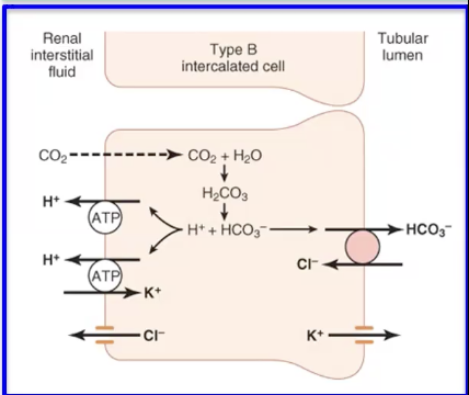 Key identifiers: Primary active H+ transporters in the basolateral membrane, and bicarb secreted on apical membrane. B cells secrete base.