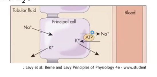 Key Identifiers: The Na+/K+ ATPase is on the basolateral membrane that keeps the sodium concentration low and potassium gradient high inside the cell. This promotes the passive movement of Na+ into cell to be actively pumped out. K+ is secreted into the lumen. Processes are regulated by aldosterone