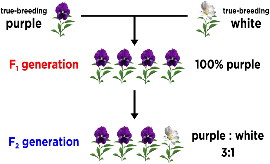 When two true-breeding parents with different traits are crossed, the offspring (F1 generation) will express only one of the traits.