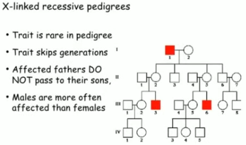 ØThe trait often skips generations, passing from an affected grandfather through a carrier daughter to an affected grandson.