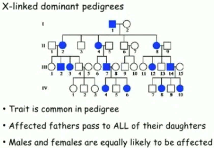 ØThis is less common. The gene is on the X chromosome, and only one copy of the dominant allele is needed to express the trait, regardless of sex.