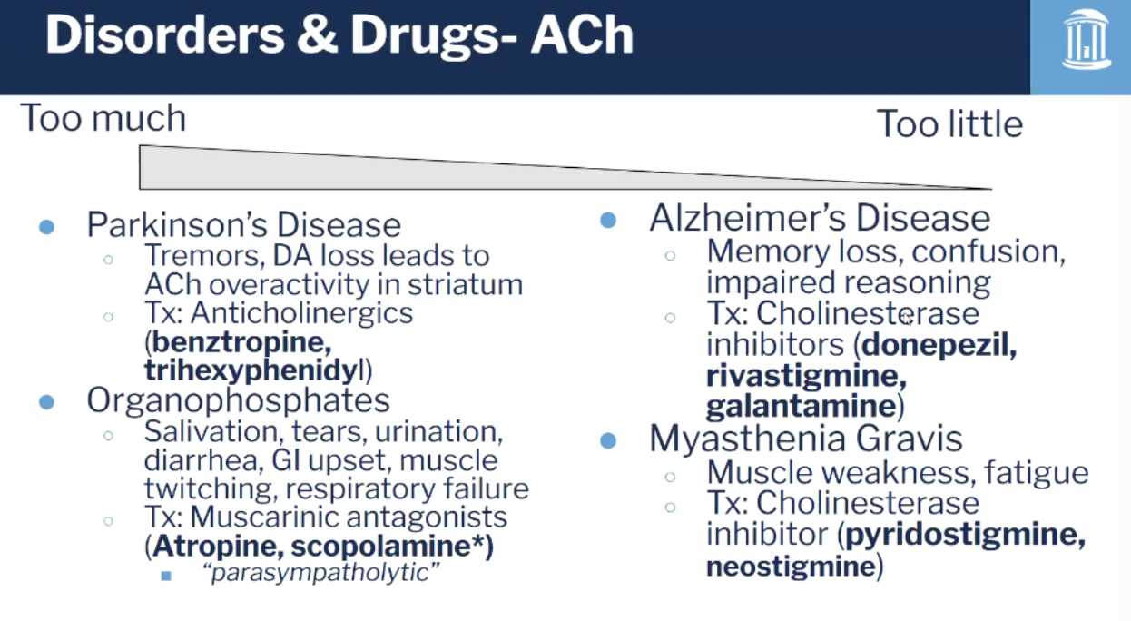 Too little ACh → muscle weakness, paralysis, cognitive deficits