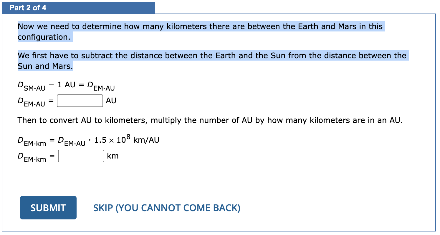 We first have to subtract the distance between the Earth and the Sun from the distance between the Sun and Mars.