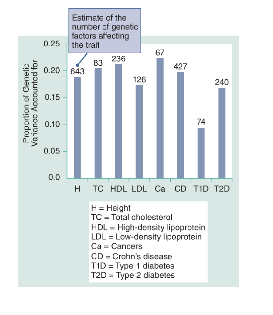 When you exame the traits, most traits are examined are affected by a large number of loci, loci typically explain only 10–20% of the total heritability of a trait.