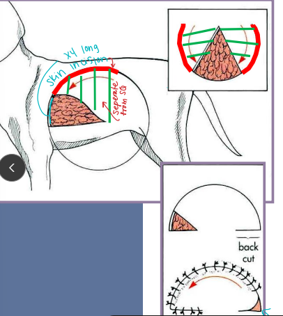 Combo V: 45° from axis of tension, extra skin is not removed → eye lid masses