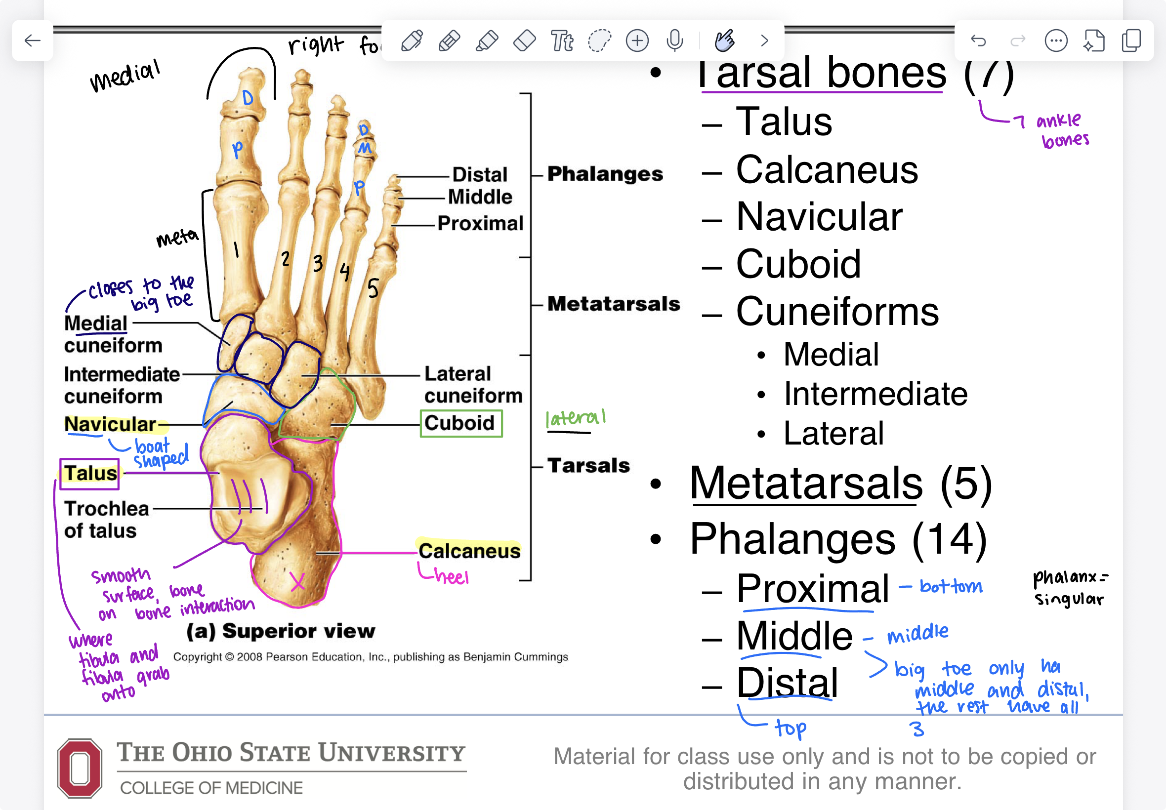 tarsal bones (7): talus (smooth surface, bone to bone interaction, where tibia and fibula grab onto), calcaneus (heel), navicular (boat shaped), cuboid (lateral side), cuneiforms (medial (closes to big toe), intermediate, lateral), metatarsals (5), phalanges (14) (proximal- bottom, middle- middle, distal- top) (big toe only has middle and distal, the rest have all