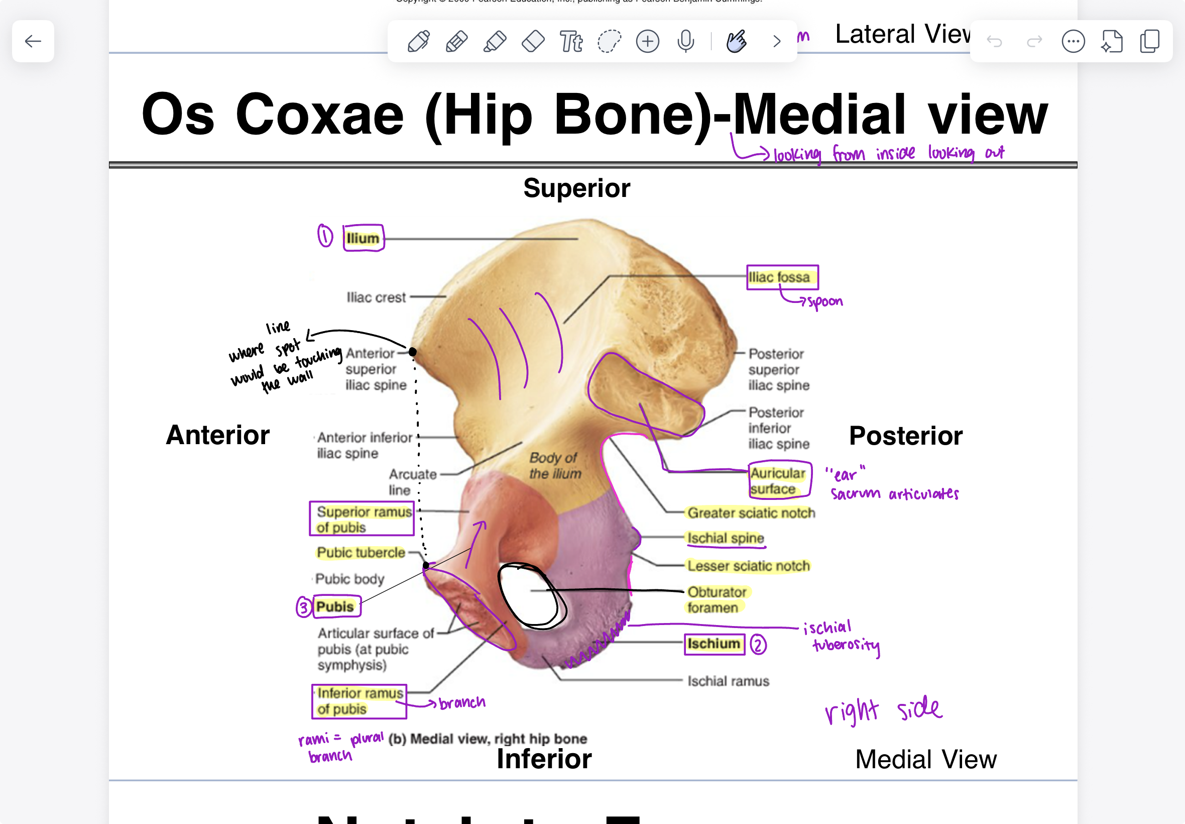 ischial spine, lesser sciatic notch, ischial tuberosity, obturator (hole)