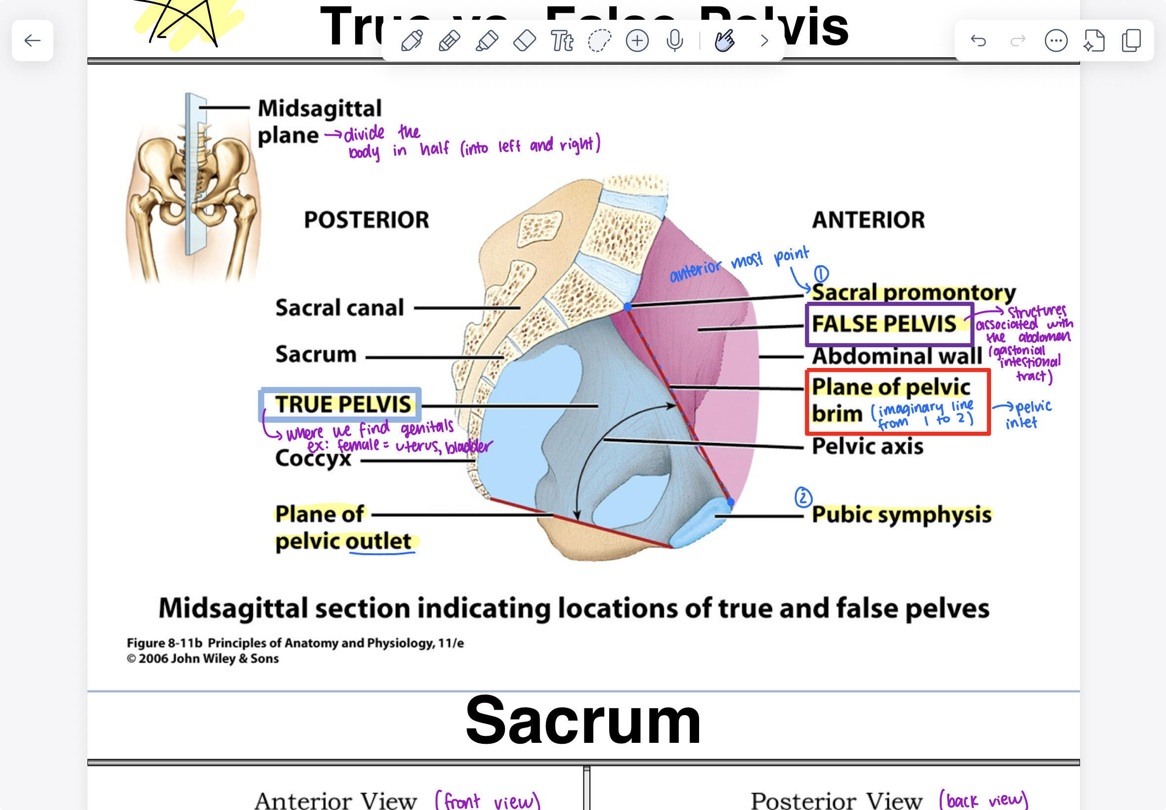 midsagittal plane (divide the body in half), true pelvis (located on posterior side, where we find genitals), plane of pelvic outlet, sacral promontory (most anterior point), false pelvis (located on anterior side), plane of pelvic brim (imaginary line between the true and false pelvis), pubic symphysis (bottom)