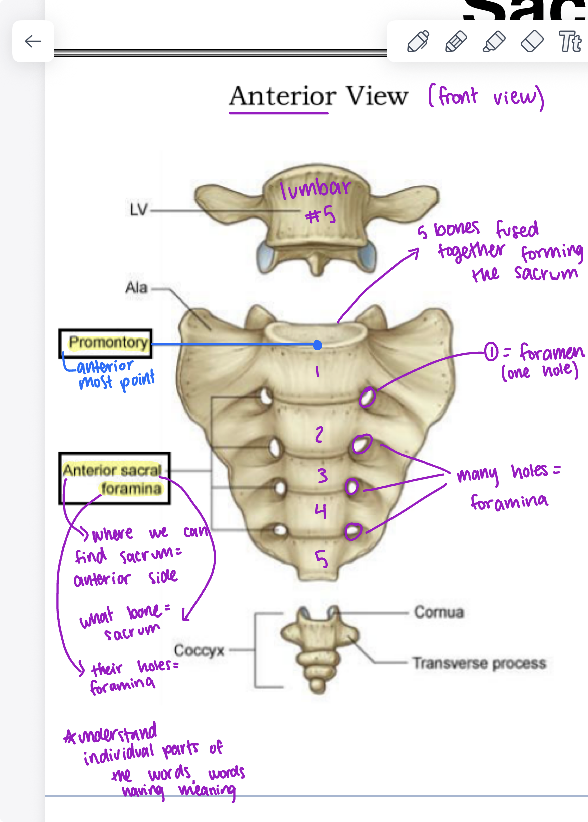 parts of sacrum (holds together 2 os coxae) (anterior view)
