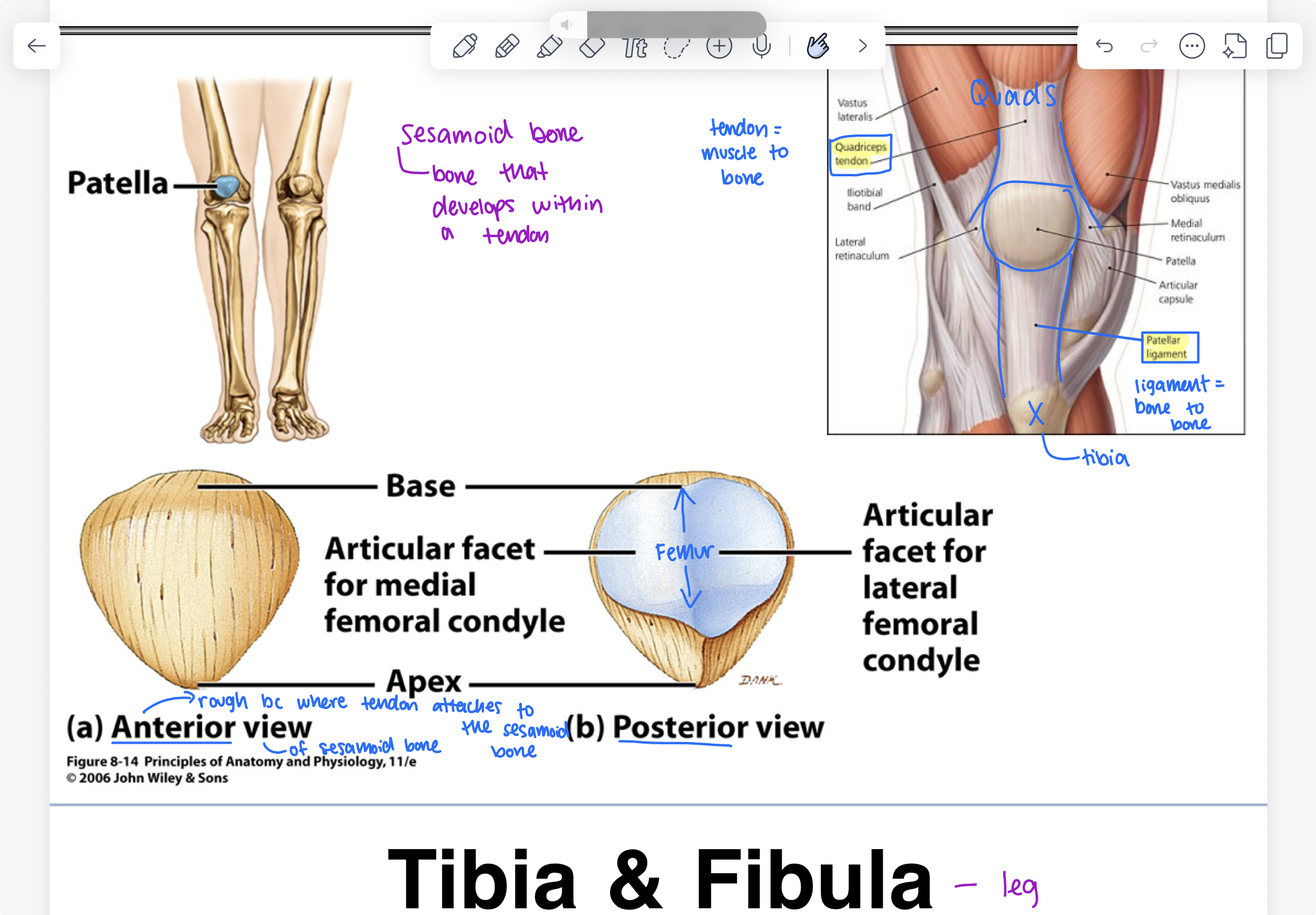 sesamoid bone (bone that develops within a tendon), quadriceps tendon (quads), patellar ligament, anterior view is rough because tendons attaches to the sesamoid bone, posterior view includes femur