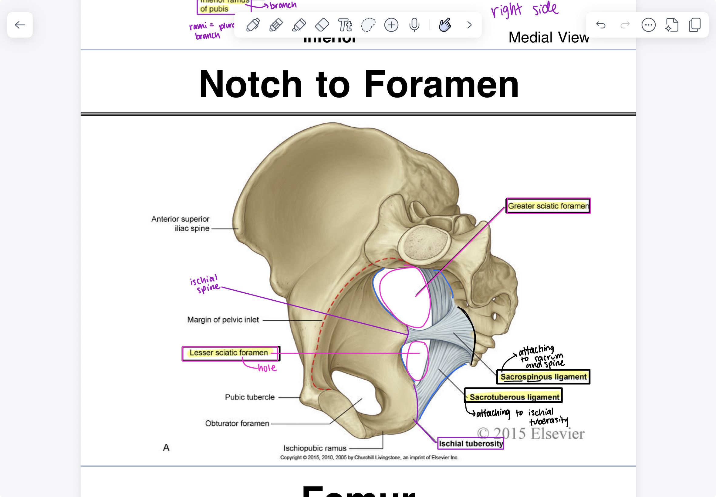 greater sciatic foramen (higher up), lesser sciatic foramen (lower hole), ischial spine, sacrospinous ligament (attaching to sacrum and spine), sacrotuberous ligament (attaching to ischial tuberosity), ischial tuberosity