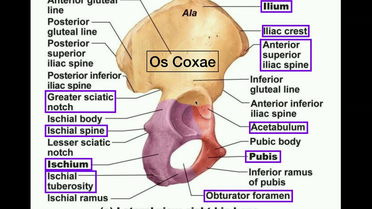 iliac crest, anterior superior iliac spine (asis), anterior inferior spine, posterior superior iliac spine, posterior inferior iliac spine