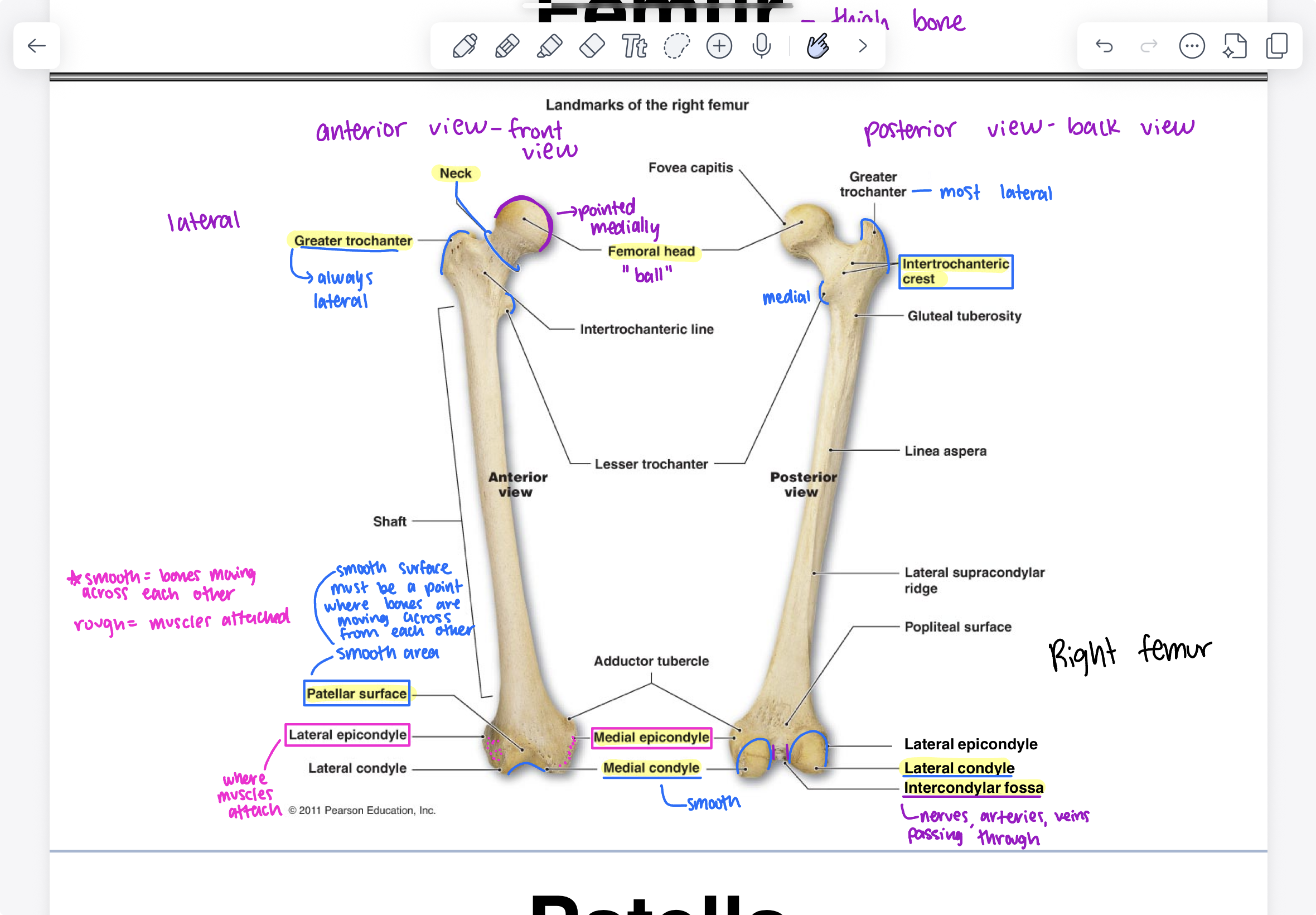 femoral head (pointed medially, “ball”), neck, greater trochanter (always lateral meaning facing outwards), patellar surface (smooth surface where bones are moving across from each other), lateral epicondyle (where muscles attach), medial epicondyle (facing inside), medial condyle (smooth, U shaped)