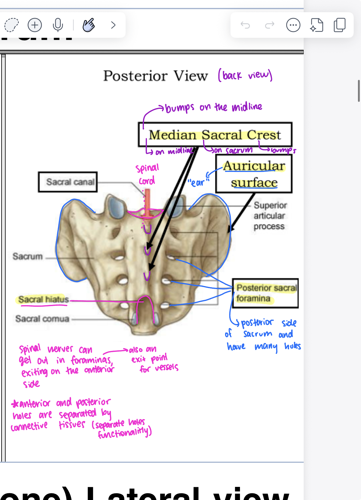 median sacral crest (bumps on the midline on sacrum), sacral canal, spinal cord, auricular surface “ear”, posterior sacral foramina (posterior side of sacrum with many holes), sacral hiatus