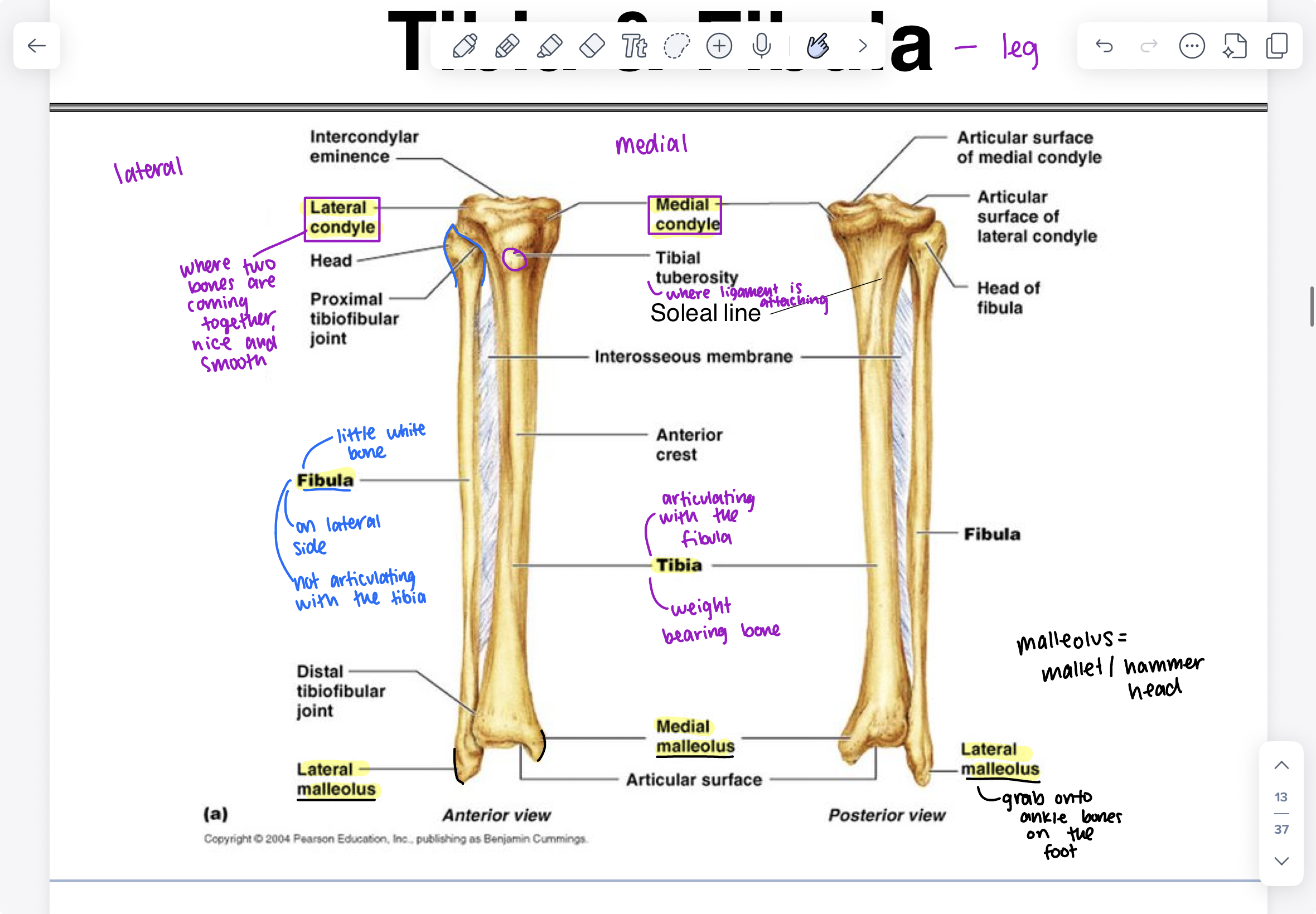 lateral condyle, medial condyle, tibial tuberosity (where ligament is attaching), fibula (on lateral side, not articulating with the tibia), lateral malleolus (bottom of fibula, grab onto ankle bones on the foot), medial malleolus (medial side of bottom of tibia)