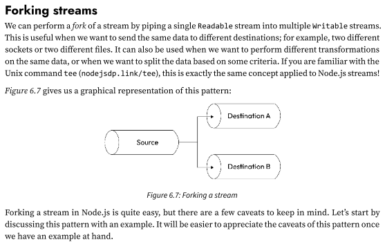 This is useful when we want to send the same data to different destinations; for example, two different sockets or two different files. It can also be used when we want to perform different transformations on the same data, or when we want to split the data based on some criteria. If you are familiar with the Unix command tee (nodejsdp.link/tee), this is exactly the same concept applied to Node.js streams!