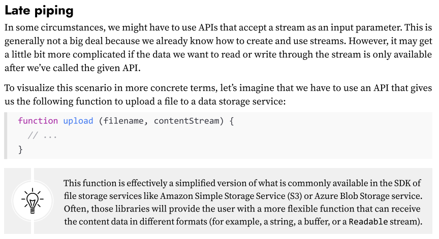 Note that you could implement an alternative version of the monitor stream by using a custom transform stream instead. In such a case, you would have to make sure that the received chunks are pushed without any modification or delay, which is something that a PassThrough stream would do automatically for you. Both approaches are equally valid, so pick the approach that feels more natural to you.