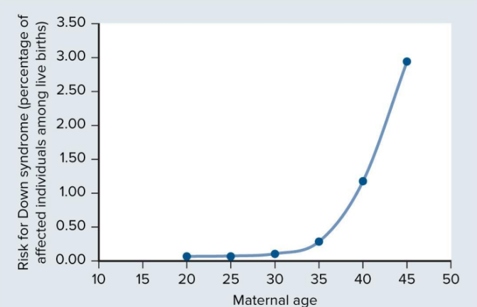 down syndrome- Trisomy 21, my be full third 21st chromosome, a translocation of part of chromosomes 21, mothers age influences risk