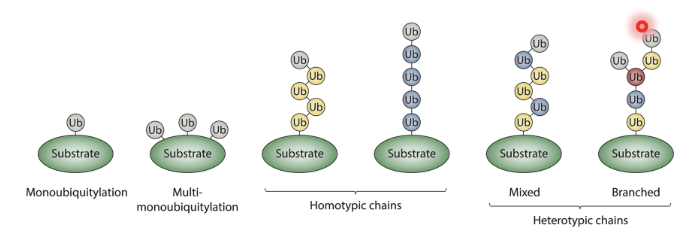 Substrates can be monoubiquitylated, multi-monoubiquitylated, form homotypic chains (chains of the same Ub), mixed or branched heterotypic chains (of different Ubs)