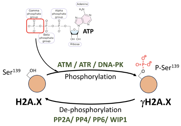Phosphate is deposited by ATM/ATR/DNA-PK transferring the γ-phosphate group from ATP to the hydroxyl group of the amino acid substrate