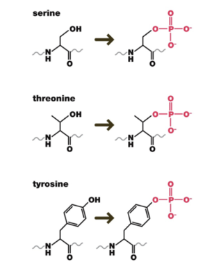 Phosphate groups can be added to the hydroxyl group of serine, threonine, or tyrosine (these amino acids are very common on the outer surface of proteins, providing many sides of the protein for kinases to act on)