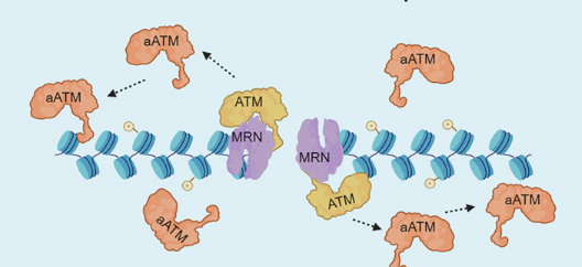 Upon binding to the MRN-DNA complex, ATM autophosphorylates and gets activated (aATM)
