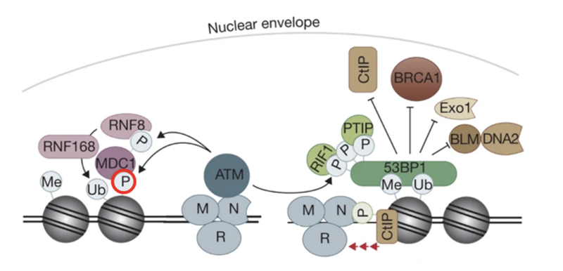 MRN complex (MRE11–RAD50–NBS1) recognises the DNA DSB and recruits ATM kinase