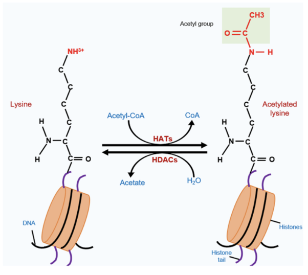 Acetyl-CoA acts as a donor, transferring its acetyl group to histone acetylatransferase (HAT) which acetylates lysine (eg. Tip60, CBP/p300, GCNS)