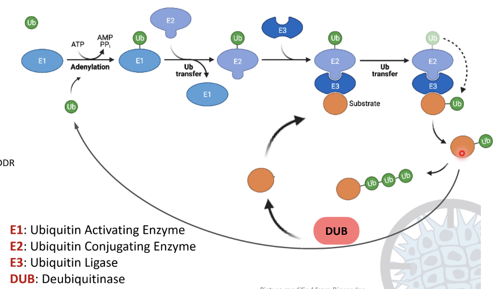 Deubiquitinases (DUBs) can hydrolyse the Ub linkage to recycle the substrate and Ub