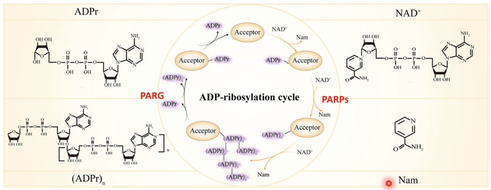 PARPs use NAD⁺ as a cofactor and transfer an ADP-ribose group from NAD⁺ to specific amino acids on target proteins (acceptors), leaving Nam as a byproduct
