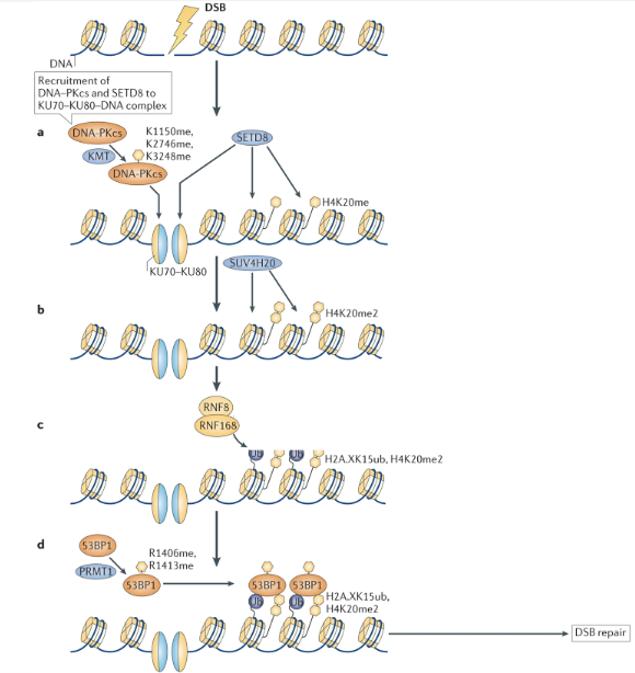 53BP1 is methylated (R1406me, R1413me) by the PRMT1, augmenting its histone binding ability and stabilising its binding to the lesion