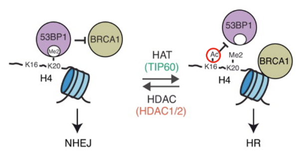 When K16 is of H4 is acetylated by Tip60, 53BP1 can not bind and BRCA1 carries out HR