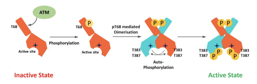 Active ATM phosphorylates at T68, causing pT68 mediated dimerisation and subsequent autophosphorylation