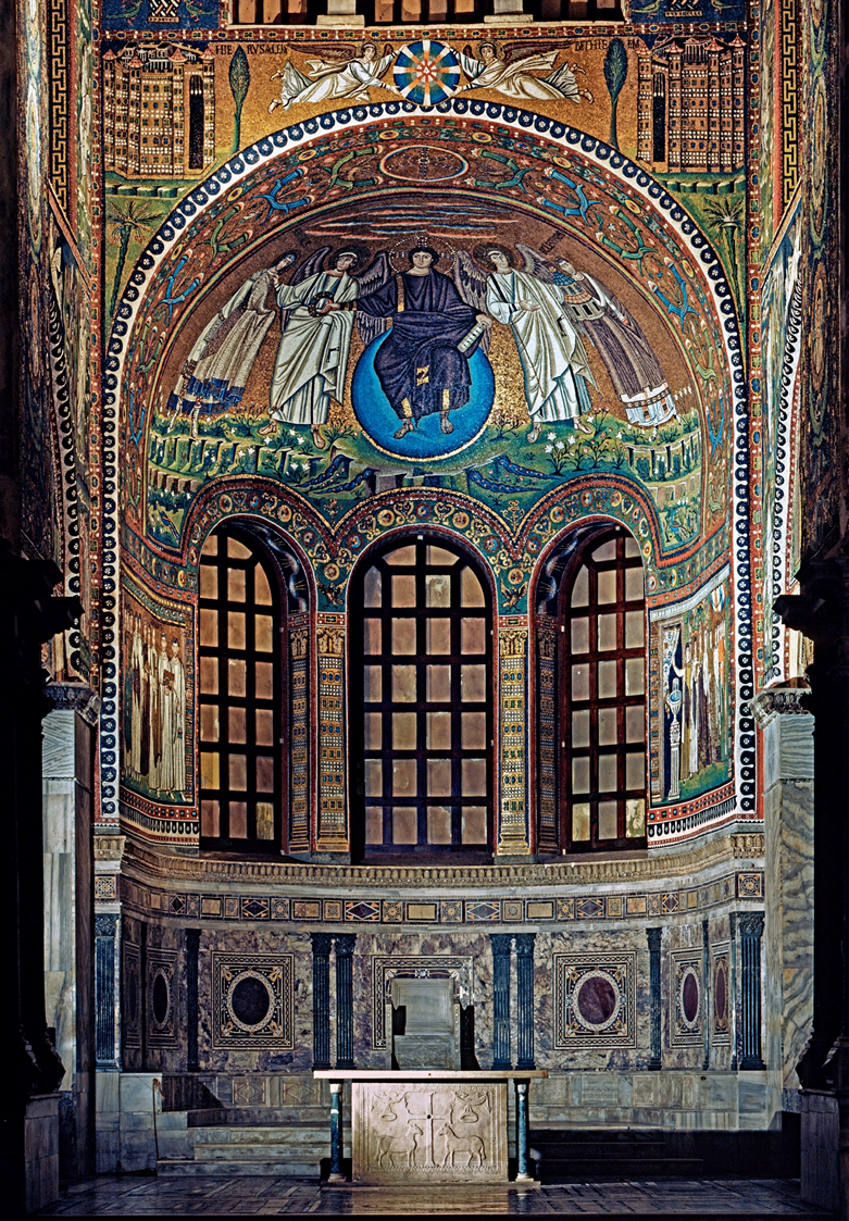 Saint Apollinaris amid sheep, apse mosaic, Sant’Apollinare in Classe, Ravenna, Italy, ca. 533 -549.