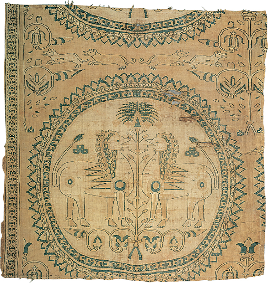 Confronting lions and palm tree, fragment of a textile said to be from Zandana, near Bukhara, Uzbekistan, eighth century