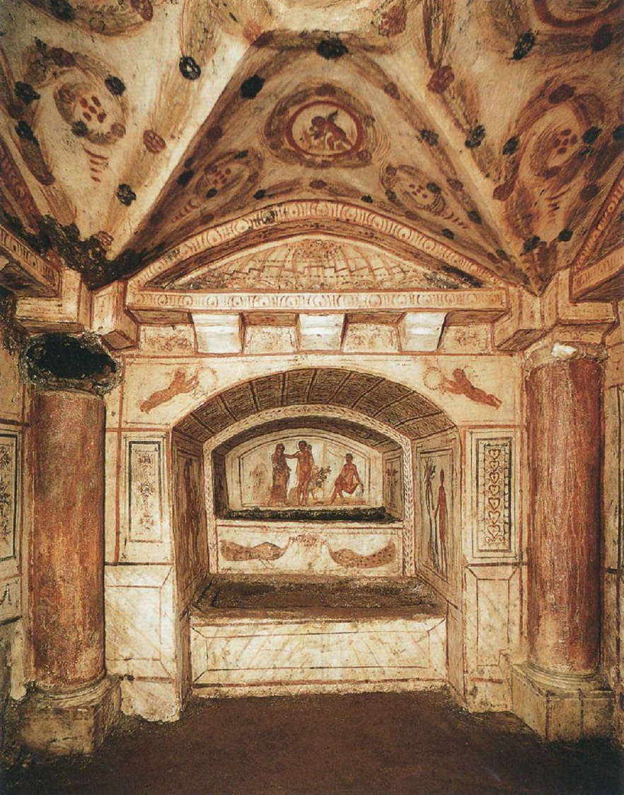 Hercules bringing Alcestis back from Hades to her husband Admetus in Cubiculum N, Via Latina Catacomb, c. 320-360 CE, fresco, Rome