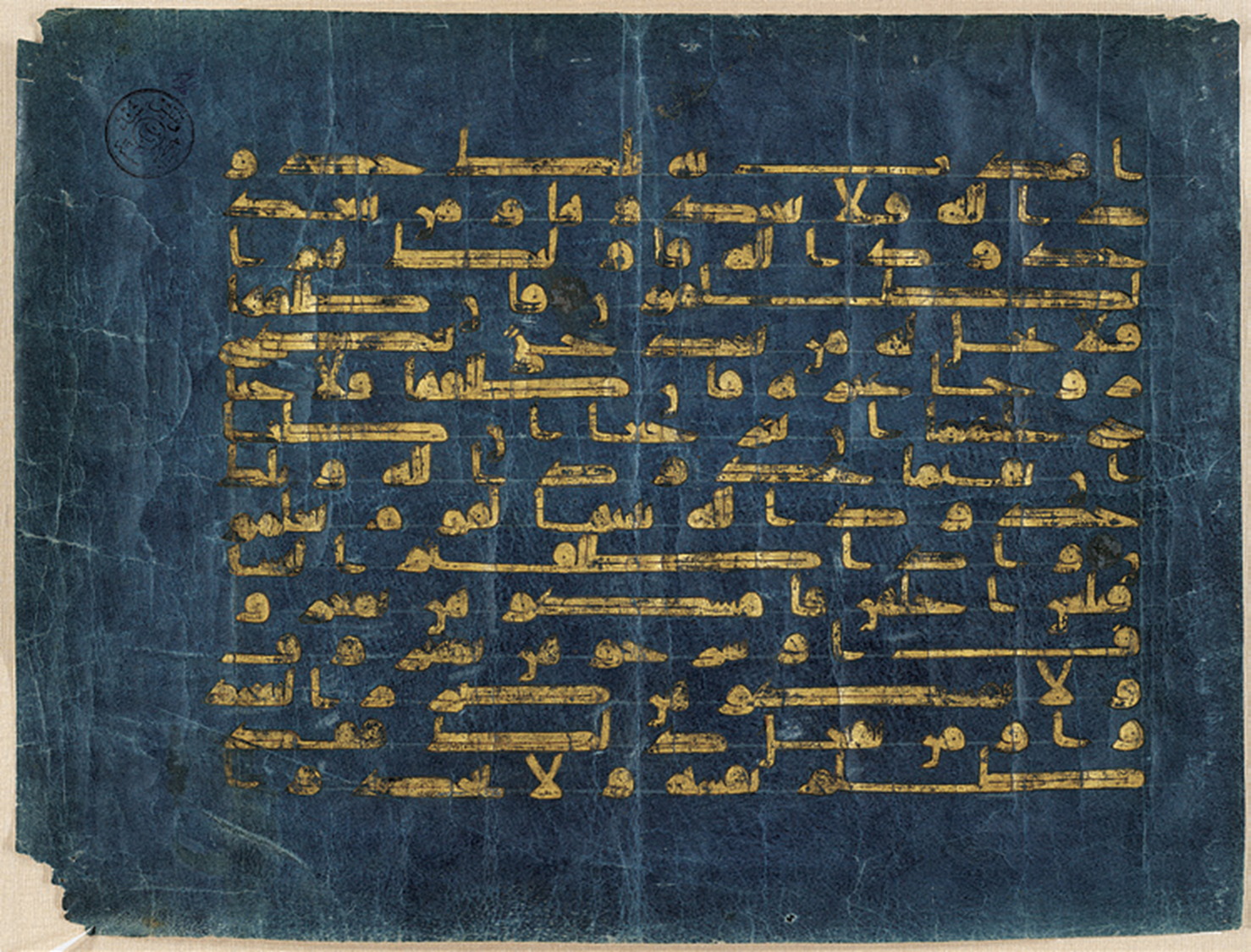 Folio from the Blue Koran with 15 lines of surah 2, from Kairouan, Tunisia, 9th to mid-10th century.
