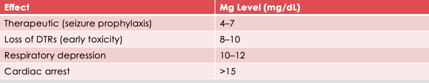 Monitor urine output, reflexes, respiratory status