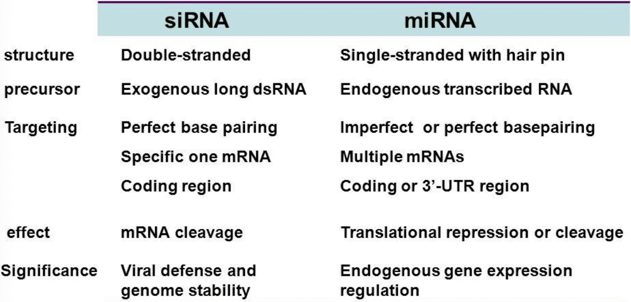 siRNA: derived from exogenous dsRNA (viruses, transposons, synthetic molecules).