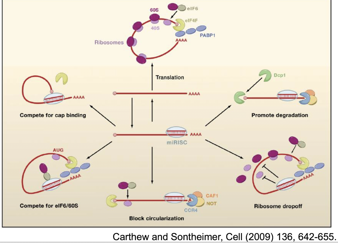 Compete for cap binding i.e. acylation factors by recruiting deadenylases and decapping enzymes