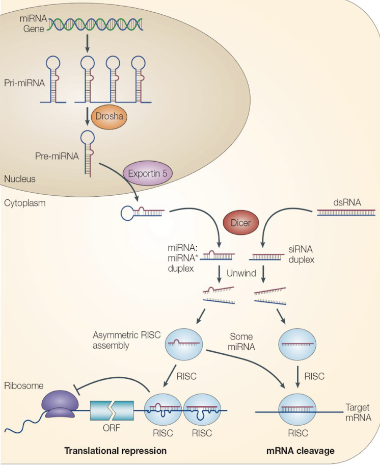 In the nucleus, Drosha is an RNase III enzyme and its cofactor DGCR8 “crop” the primary miRNA transcript (pri-miRNA) into a precursor miRNA (pre-miRNA) with a stem-loop structure.