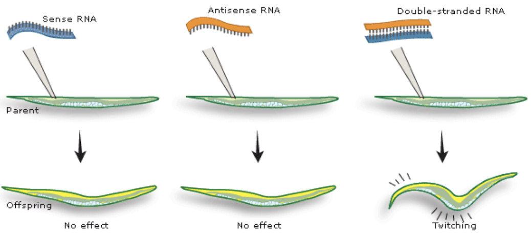 Found that double-stranded RNA (dsRNA) silenced expression of a gene for muscle function more effectively than antisense RNA, causing it to twitch in a similar way to worms that lacked a functional muscle protein gene.
