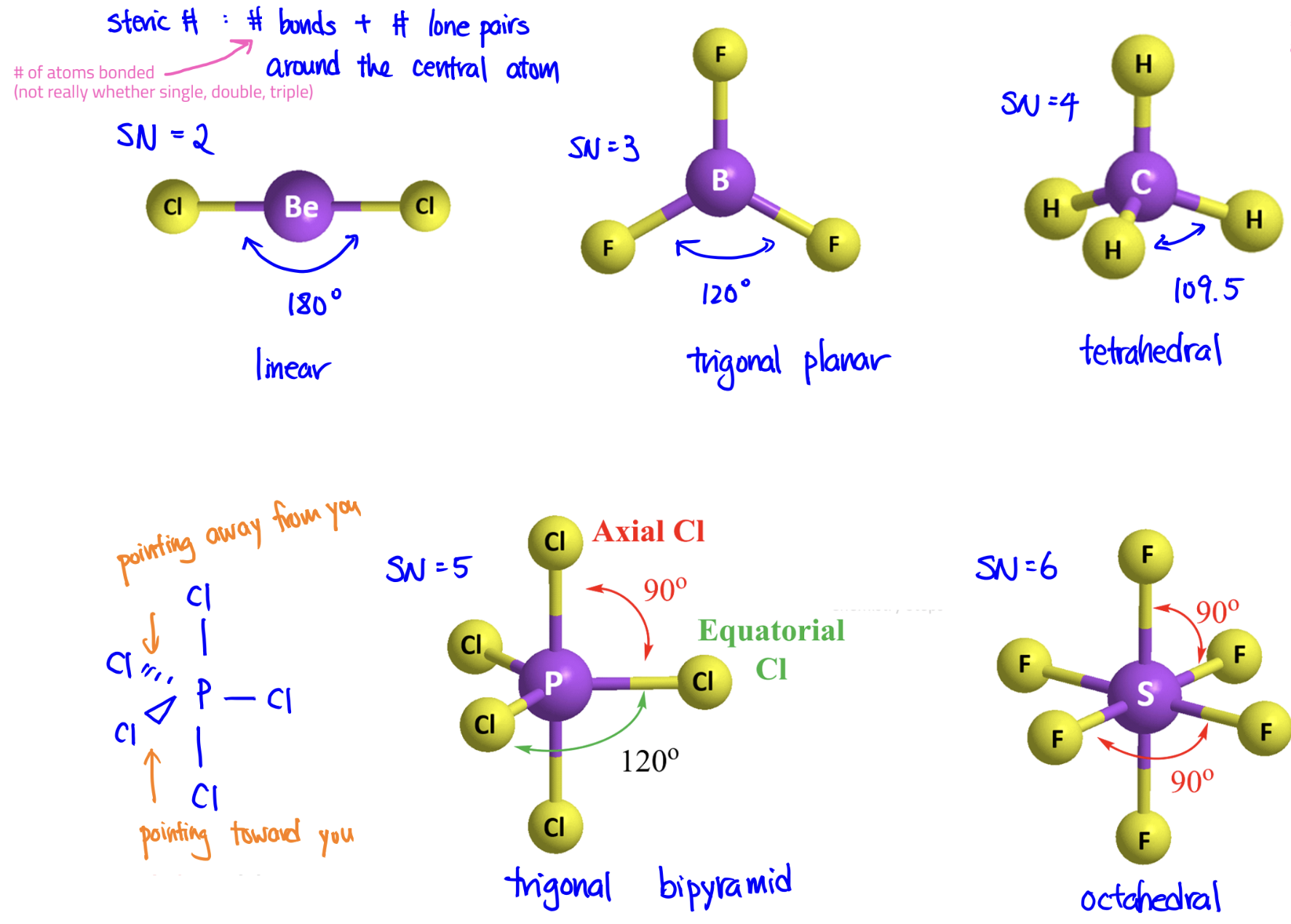 Bonds and lone pairs repel one another and, to minimize their repulsions, the bonds and lone pairs move as far apart as possible while maintaining the same distance from the central atom.